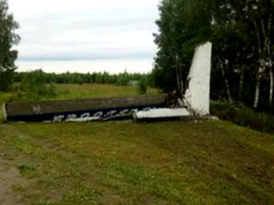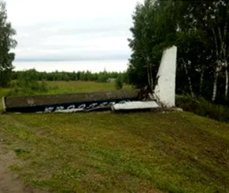 Стеллу снесли в результате ДТП, которое произошло здесь, на трассе Ярославль-Кострома в районе посёлка Прибрежный. В Интернете поговаривают, что ночью в инсталляцию врезалась машина, съехавшая в кювет из-за дождливой погоды, но в областном ГИБДД пока нет официальных данных по этому поводу.