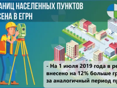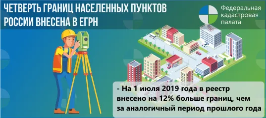 На 1 июля 2019 года количество сведений о границах населенных пунктов, внесенных в ЕГРН, составляет 39,4 тыс., что на 12% больше по сравнению с началом текущего года. За первое полугодие 2019 года в ЕГРН внесены сведения о 4,2 тыс. границ населенных пунктов. По состоянию на конец II квартала 2019 года в ЕГРН содержатся сведения о 25,3% границ населенных пунктов. Общее количество населенных пунктов в Российской Федерации – 155,7 тыс.