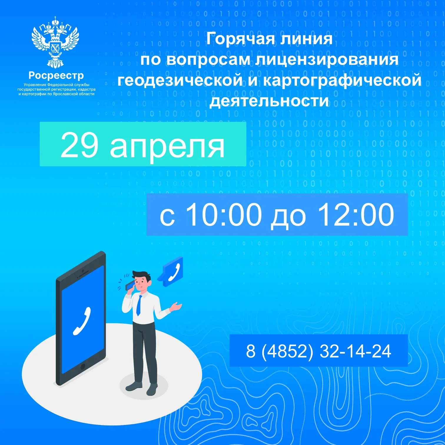 С 10:00 до 12:00 специалист отдела геодезии и картографии, землеустройства и мониторинга земель, кадастровой оценки Управления ответит на вопросы заявителей по телефону: 8 (4852) 32-14-24.