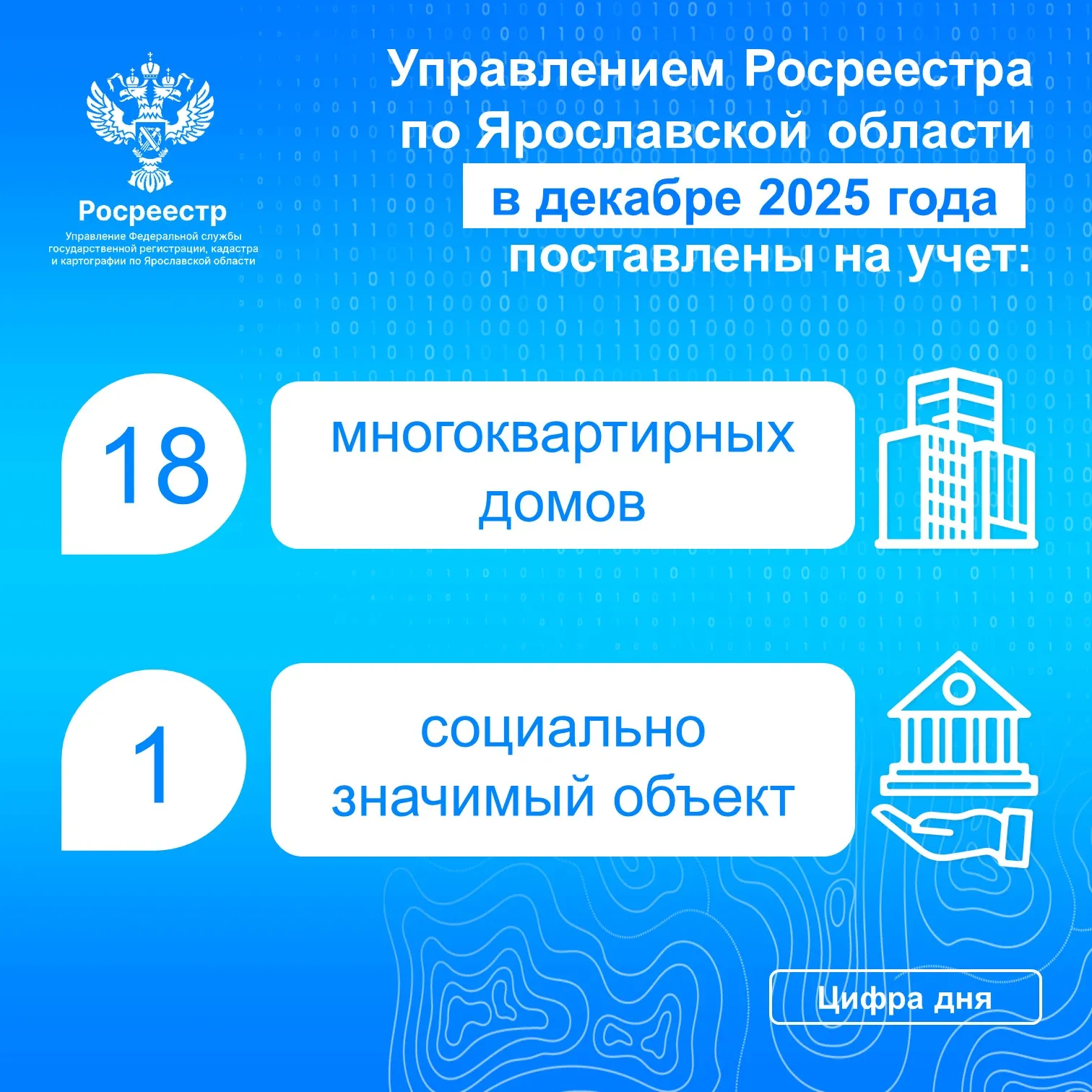 Управление Росреестра по Ярославской области в декабре 2025 года осуществило государственный кадастровый учет 18 многоквартирных зданий и общеобразовательной школы, рассчитанной на 1100 учеников.