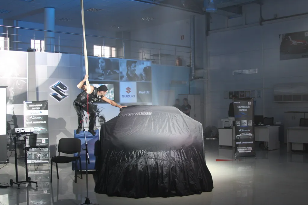 И вот настал долгожданный момент, внезапно погас свет, заиграла динамичная музыка, и откуда-то сверху показалась тень человека. Зрители пришли в восторг от экстремальной демонстрации в воздухе гимнастических трюков на ремнях прямо над крышей нового автомобиля. Под не смолкающие аплодисменты и вспышки фотокамер гимнаст закончил своё выступление поднятием навеса с автомобиля. В поле зрения оказался виновник торжества, и гости вечера смогли познакомиться с автомобилем: осмотреть салон, посидеть за рулем, заглянуть в багажное отделение и под капот.