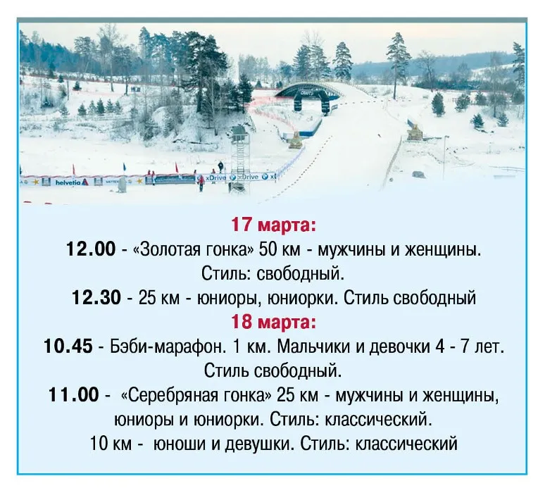 В центре лыжного спорта и отдыха «Демино» все готово к большим лыжным гонкам. 17 и 18 марта здесь пройдет одно из главных состязаний сезона: шестой международный Деминский марафон. Старт 50-ти километрового марафона объявят 17 марта в 12 часов, а 18 марта пройдет короткая гонка на 25 километров. По оценке организаторов марафон соберет многих именитых гостей. Это олимпийский чемпион Никита Крюков, победитель прошлого марафона Сергей Ширяев, один из лучших марафонцев Алексей Петухов, будет и знаменитая спортсменка из Швейцарии Наташа Кортези и многие другие звезды. «На участие в гонке зарегистрировались 1507 участников: 1388 мужчин и 119 – женщин. География городов – от Сахалина до Калининграда, от Волгограда до Мурманска. Около 30 спортсменов из других стран. В бэби-марафоне примут участие 50 дошколят. Словом, можно уверенно сказать, что возраст марафону не помеха: самому юному участнику соревнований 4 года, самому опытному – 76 лет», - сообщил один из организаторов соревнований Александр Игнатьев. Состязания в Демино зарекомендовали себя настолько хорошо, что у Ярославской области появился реальный шанс войти в Worldloppet - международную федерацию лыжных марафонов, элиту мировых спортивных состязаний. Организаторы марафона обещают зрителям незабываемое спортивное зрелище и культурную программу. Кроме того, будет обеспечено горячее питание, продажа спортивного инвентаря и сувениров. Традиционно в дни проведения лыжного марафона в Демино собираются не только спортсмены, но и множество зрителей, для которых Деминский марафон – не только возможность еще раз окунуться в мир спортивных страстей, но и прекрасно отдохнуть с детьми и друзьями. Для болельщиков организуется торговая ярмарка, развлекательная программа. 17 марта сразу после старта Золотой гонки – концерт группы «Руки вверх» и Dj Чижова. В дни марафона жители области могут доехать в Дёмино на специальных автобусах. Расписание движения автобусов «Рыбинск – Демино» в дни проведения «Деминского марафона» 17 – 18 марта. 17 марта 2012 г. Автобусный маршрут №112т «Железнодорожный вокзал – Демино» Начало движения от железнодорожного вокзала с 11.00 Последний рейс отправления из Демино в 15.15 Интервалы отправления 15-20 минут. Автобусный маршрут «Соборная площадь – Демино» Время работы маршрута с 11.00 до 15.00 Интервалы отправления 30-35 минут (по мере наполняемости) 18 марта 2012 г. Автобусный маршрут №112т «Железнодорожный вокзал – Демино» Начало движения от железнодорожного вокзала с 9.50 Последний рейс отправления из Демино в 14.30 Интервалы отправления 25-30 минут. Автобусный маршрут «Соборная площадь – Демино» Время работы маршрута с 10.00 до 14.30 Интервалы отправления 30-35 минут (по мере наполняемости) Стоимость проезда 28 рублей. Проездные билеты не действуют. Льготы не предоставляются.