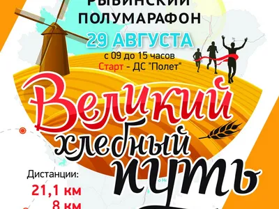 29 августа 2015 г. Рыбинск готовится отметить традиционный праздник День города. Его главным событием станет полумарофон «Великий хлебный путь» на дистанцию три, восемь и 21 километр по историческому центру, где располагаются рыбинские достопримечательности: здание бывшей Хлебной биржи, в котором находится Рыбинский музей-заповедник, Спасо-Преображенский собор, памятники Бурлаку, адмиралу Ф. Ушакову, промышленнику и меценату Л. Нобелю, поэту Л. Ошанину. Ожидается, что на старт выйдут порядка 1500 человек - рыбинцы и гости города. Сейчас подано 1279 заявок. Возраст участников от 13 до 75 лет. Среди участников представители 63 городов, 17 регионов страны. По рыбинским улицам пробегут два представителя Мексики. Организованными группами в марафонском старте примут участие школьники из Рыбинска, Рыбинского и Пошехонского районов. Заявки на участие можно оформлять на сайте www.goldenringrun.ru или зарегистрироваться лично во ДС «Полет» (с понедельника по пятницу с 16 до 19 часов, бокс №100). Регистрация открыта до 28 августа.