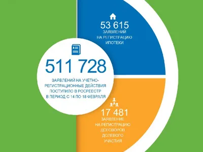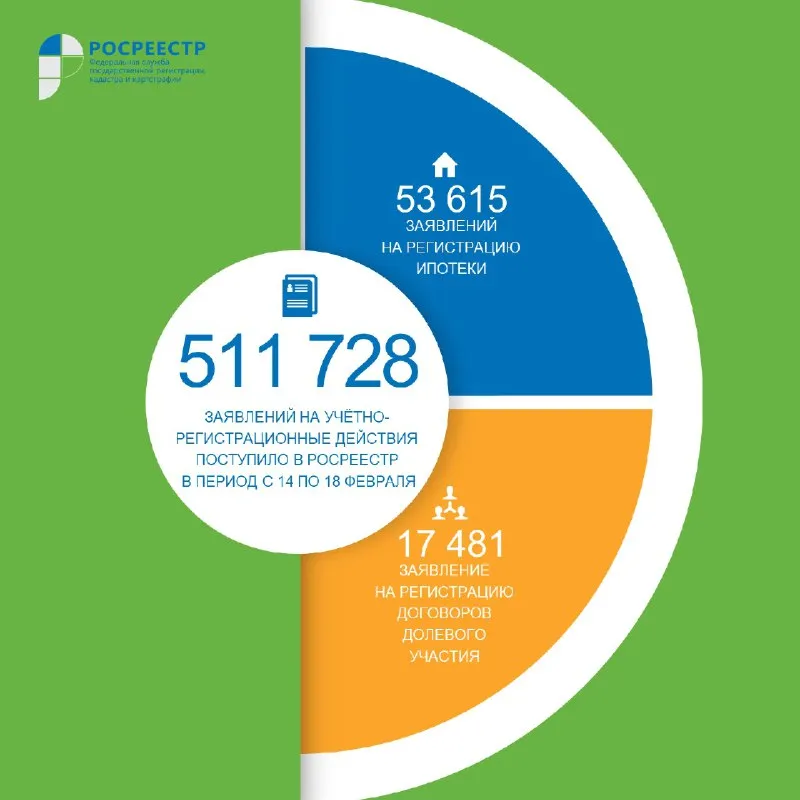 За минувшую рабочую неделю c 14 по 18 февраля 2022 года на учётно-регистрационные действия в Росреестр было подано в общей сложности 511 728 заявлений. На регистрацию ипотеки поступило 53 615 заявлений, а на регистрацию договоров долевого участия (ДДУ) – 17 481.