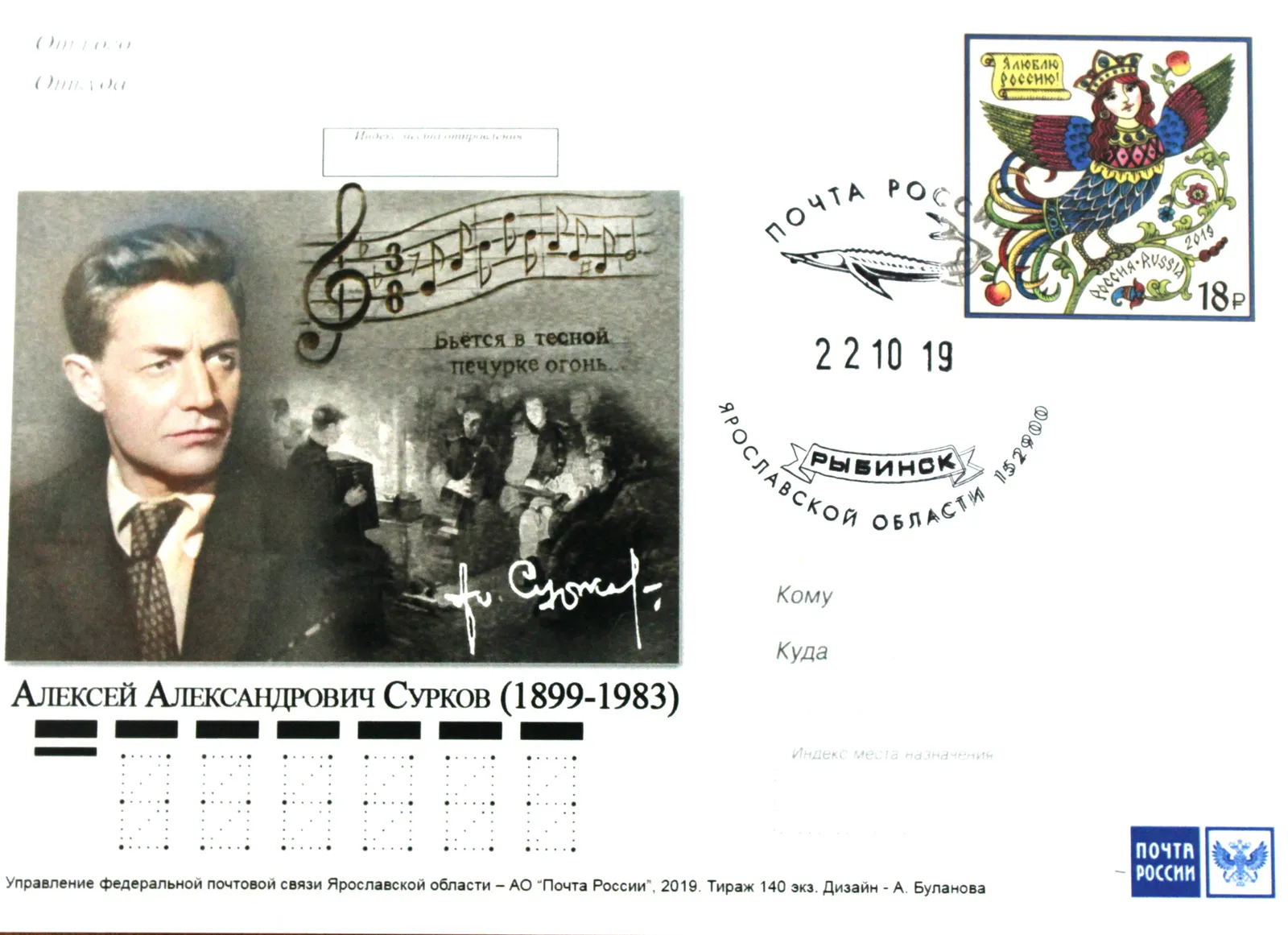 На немаркированной открытке, выпущенной ярославскими филателистами ограниченным тиражом, изображён портрет поэта-фронтовика Алексея Александровича Суркова с цитатой из знаменитого стихотворения «Землянка». Автором-дизайнером выступила посткроссер Анна Буланова.