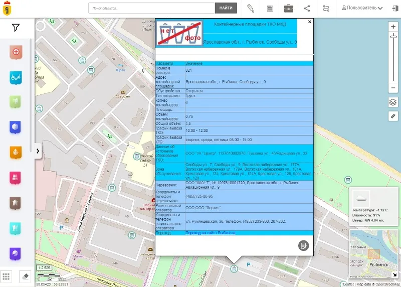 На карте указана, где расположена та или иная площадка, какая управляющая компания отвечает за ее обслуживание, кто перевозчик, график уборки и куда обращаться в случае его не соблюдения, а также сколько контейнеров и какого объема установлены на конкретной площадке.