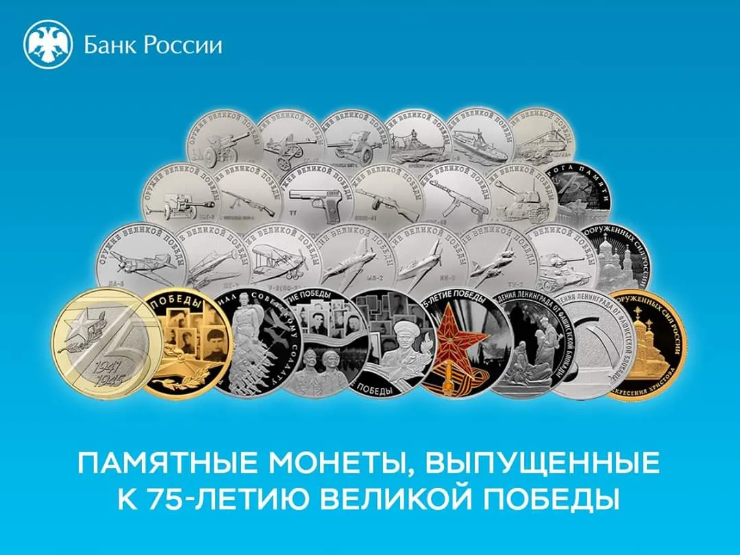 В самой многочисленной серии "Оружие Победы" - 19 памятных недрагоценных монет номиналом 25 рублей, тираж каждой – один миллион. Кроме того, в юбилейной коллекции представлены серии «75-летие полного освобождения Ленинграда от фашистской блокады», «75-летие победы советского народа в Великой Отечественной войне».