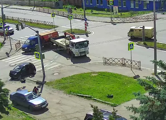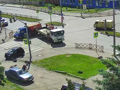 В Ярославле произошло курьёзное ДТП. Эвакуатор подъехал забрать пострадавшую в аварии иномарку. Когда он разворачивался на перекрёстке Лисицына-Мышкинский проезд, то сам не избежал столкновения с другим авто. Вот такая множественная авария среди бела дня.