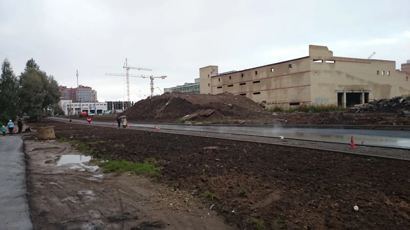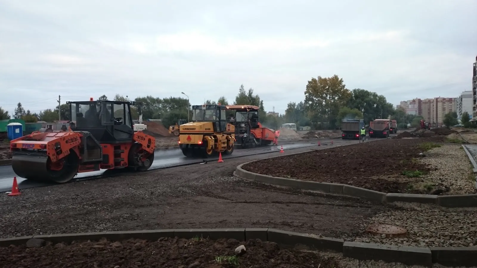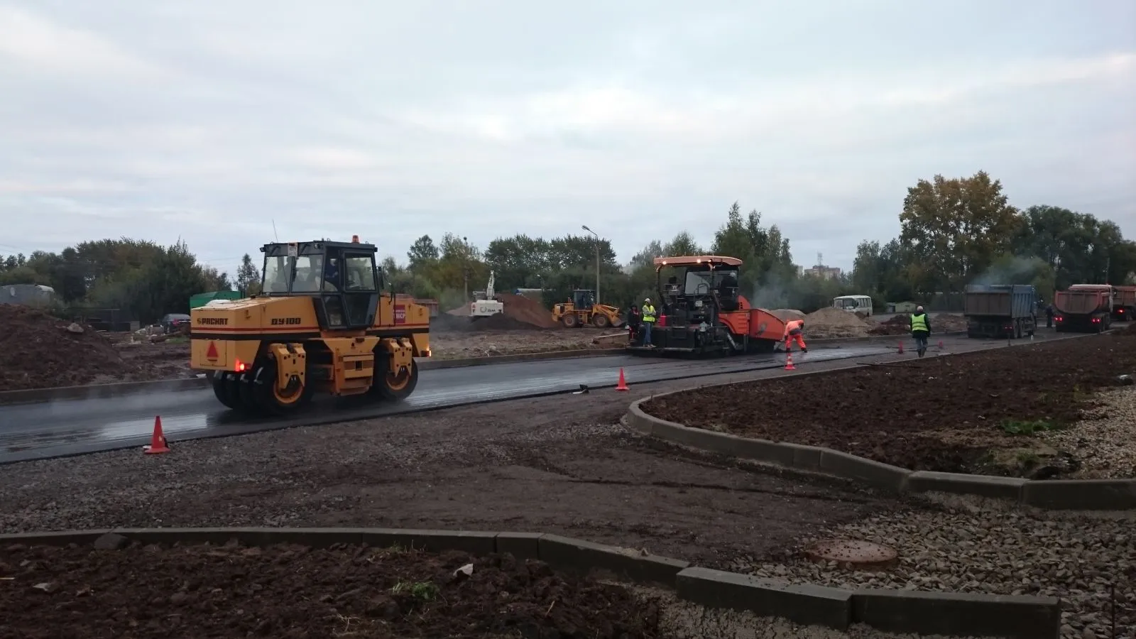Подрядчик ОАО «Рыбинское УМСР» приступил к работам по укладке асфальта пока позволяет погода. К тому же щебень, обеспечивающий дренаж, уже уложен.