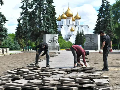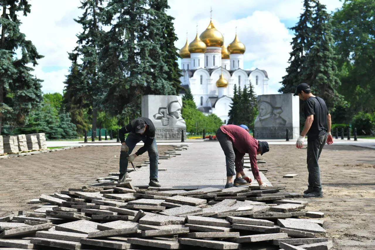 Подрядчик начал благоустраивать территорию возле памятника «Вечный огонь» и Успенского собора. На первом этапе заменят покрытие и основание от улицы Почтовой до Успенского собора.