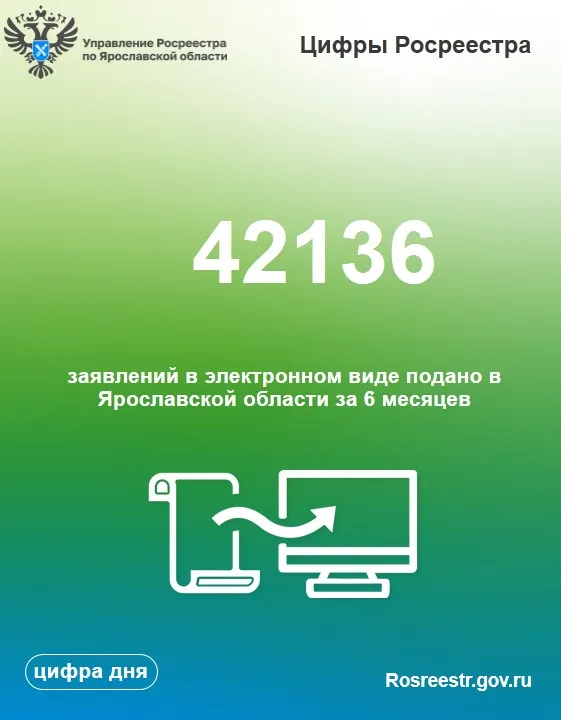 За 6 месяцев 2022 года в Управление Росреестра по Ярославской области подано 42136 заявлений в электронном виде, что составляет 42, 4 % от общего количества заявлений. При этом доля электронных услуг по сравнению с аналогичным периодом 2021 года выросла на 4 %. К концу 2022 года Управлением планируется достичь показателя в 45%.