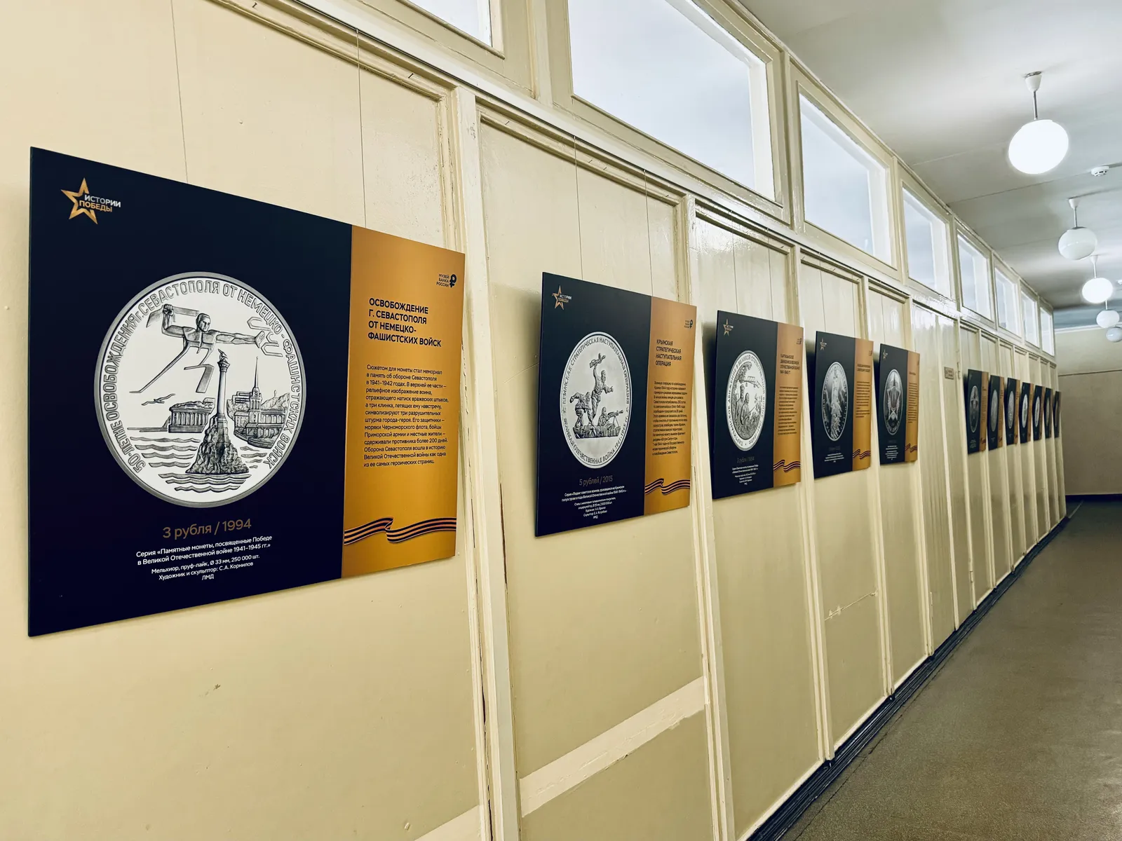 Экспозиция представляет собой двенадцать увеличенных фотоизображений памятных монет, посвященных Великой Отечественной войне.