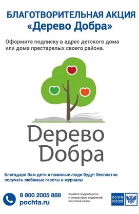Благотворительная акция «Дерево добра» проводится Почтой России с 2015 года. В 2019 году жители Ярославской области подарили подопечным социальных центров региона более 1048 экз.) газет и журналов. Оформить благотворительную подписку на периодику также можно в адрес домов престарелых и инвалидов, городских и сельских библиотек, образовательных учреждений Министерства обороны. Цель акции - обеспечить детей развивающими изданиями, а пенсионеров - свежей и интересной прессой.