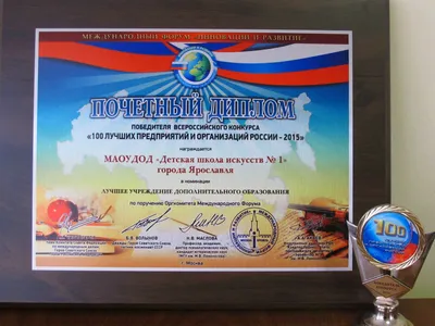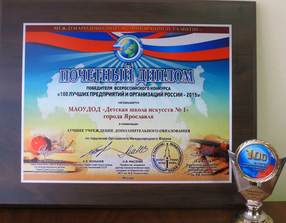 Первое место завоевала ярославская детская школа искусств № 1 на всероссийском конкурсе «100 лучших предприятий и организаций России-2015». Гран-при ей удалось получить в номинации «Лучшее учреждение дополнительного образования». Результаты были оглашены в Москве в рамках международного форума «Инновации и развитие». В передовой ярославской школе проходят обучение одновременно более 700 человек!