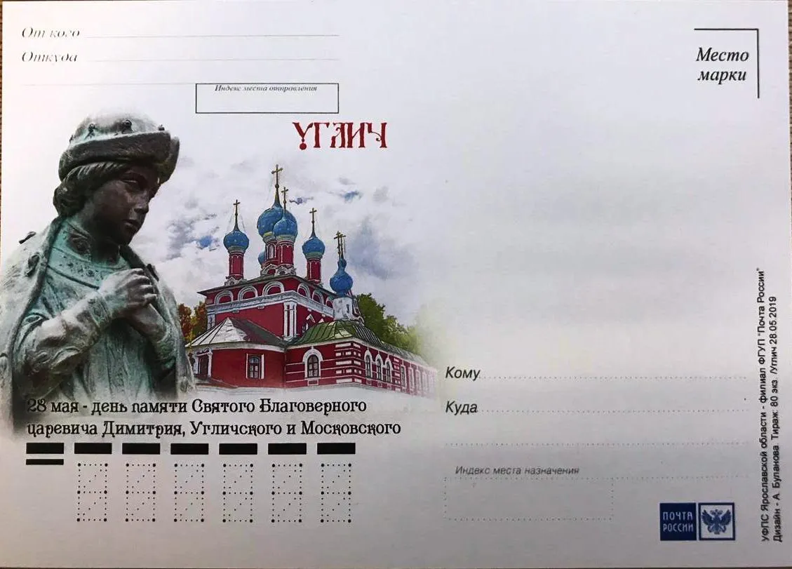 28 мая, в день памяти благоверного царевича Димитрия, Угличского и Московского, ярославские филателисты выпустили ограниченным тиражом немаркированную почтовую карточку и провели в центральном почтовом отделении Углича спецгашение переводным художественным штемпелем «Углич. Золотое кольцо».