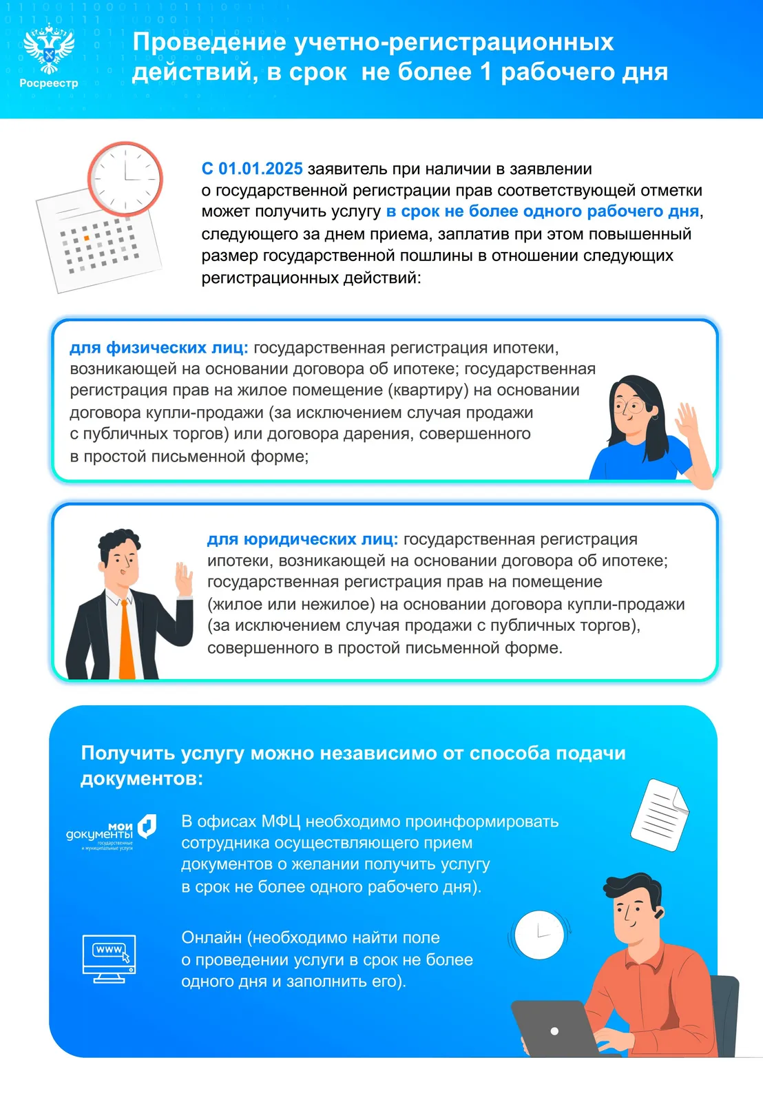 Специалисты Управления напомнили о том, что с 01.01.2025 для заявителей установлена возможность получения услуг Росреестра в срок не более 1 рабочего дня при соблюдении определенных условий, установленных в законе.