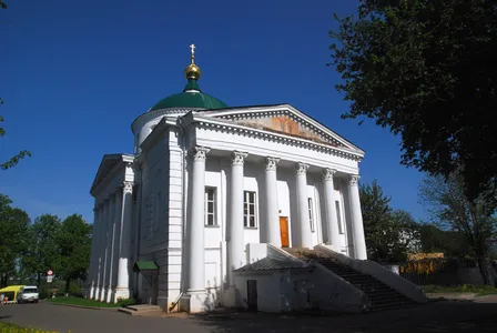 Правда, от следа того собора XVII века не осталось и следа. На его месте сейчас стоит совсем иной храм, не волне обычный для местной архитектурной школы. При беглом осмотре он скорее напоминает афинский некрополь, чем православную святыню. Белокаменные колонны с четырёх сторон, треугольные фронтоны, массивные ступени, ведущие к центральному входу, — всё это вполне в духе греческих или римских традиций.